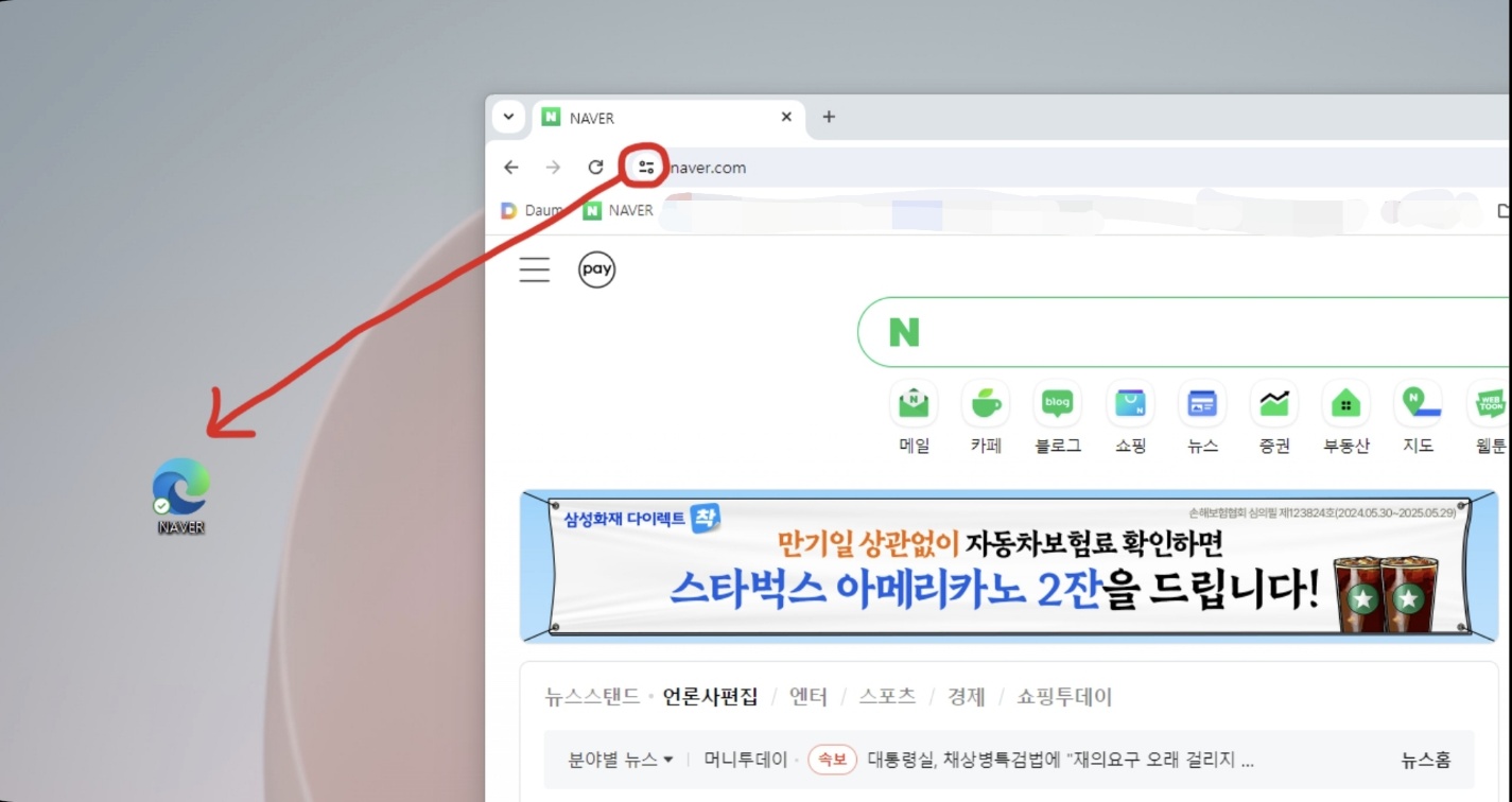 웹 브라우저 열기: 먼저 사용 중인 웹 브라우저를 엽니다. 네이버 홈페이지 접속: 주소창에 www.naver.com 를 입력하여 네이버 홈페이지에 접속합니다.  네이버 홈페이지의 주소창 왼쪽에 있는 자물쇠 아이콘(또는 네이버 로고)을 바탕화면으로 드래그합니다. 바탕화면에 생성된 아이콘을 클릭하면 네이버 홈페이지로 빠르게 접속할 수 있습니다.